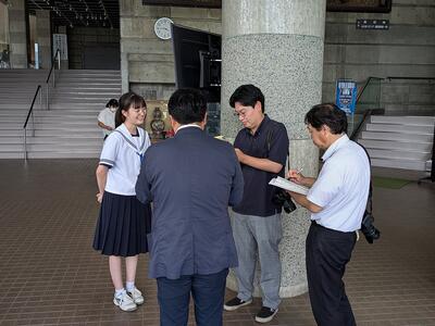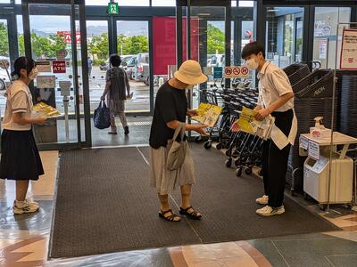 7月18日(木)、一日保護司委嘱伝達式が本校で行われました。全校生徒が体育館に集い、奥州地区保護司会前沢支部の那須川孝支部長よりお話をいただいた後、生徒を代表して、生徒会役員の白石千桜さんと佐々木陽翔さんの2名にたすきがかけられました。二人は、放課後にイオン前沢店に出向き、保護司会の方々と共にチラシやパンフレットなどを買い物客に手渡していきながら、啓発活動を行いました。
