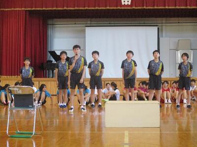 6月13日(木)、地区中総体壮行式を行いました。各部それぞれ工夫を凝らしたパフォーマンスで、チームの意気込みと団結を表現しました。当日は、どの会場においてもプレーの面、マナーの面でも「チーム前中!」で力を発揮してほしいと思います。
