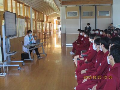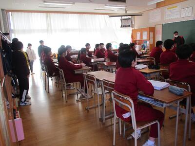 1月24日(水)、前沢小6年生を中学校に招き、新入生交流会を開催しました。前半は中学校の授業の様子を見て回り、後半は生徒会執行部から学校生活についての説明や、小グループに分かれて本校2年生との座談会を行いました。座談会では、中学校の学習や部活動について、たくさんの質問が出され、中学生が丁寧に答える様子が見られました。最後は中学生が合唱を披露しました。この交流会で6年生が抱いていた不安が少しでも和らぎ、期待に胸を膨らませて4月に入学してくることを心待ちにしています。