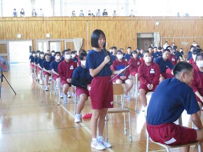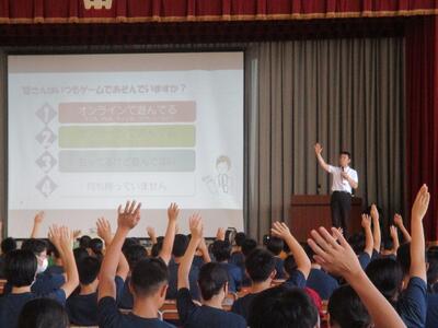 9月27日(水)、未来の風せいわ病院理事長、智田文徳氏を講師としてお招きし、「中学生のための命の大切さを考える講演会」を開催しました。ゲーム依存・ネット依存に関わる講演で、生徒はグループで話し合いをしたり、グループで出た意見を発表したりしながら、興味をもってお話を聞くことができました。また、PTA企画部のみなさんには準備や保護者受付を行っていただきました。ありがとうございました。