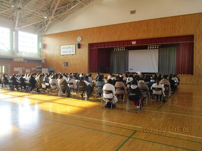 2月8日(水)に、来年度入学予定の保護者を対象とした「新入生保護者説明会」を開催しました。学校からは中学校での学習や生活の様子、入学にあたって準備していただくことについて説明しました。また、奥州警察署生活安全課の野呂拓治様を講師として、情報モラル講演会も行いました。たくさんの新入生の保護者の方がご来校くださり、熱心に話を聞いている様子がうかがえました。誠にありがとうございました。4月を迎えるのを心待ちにしております。