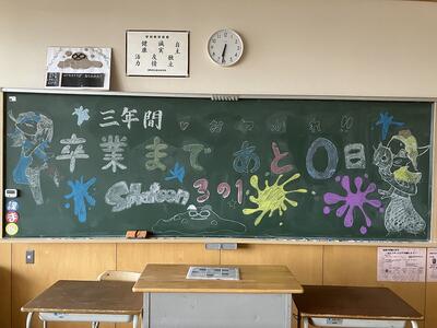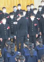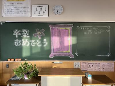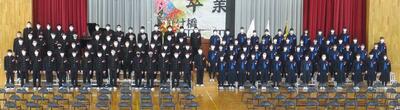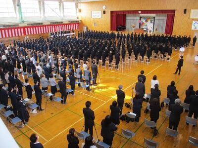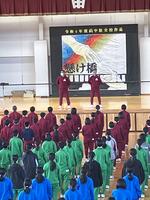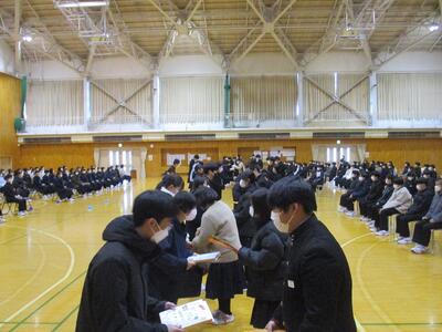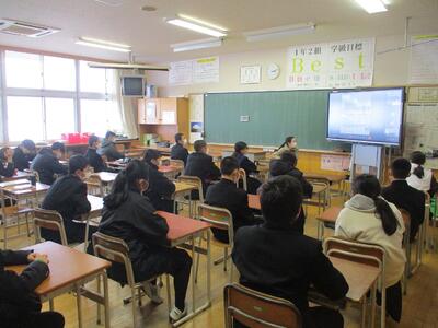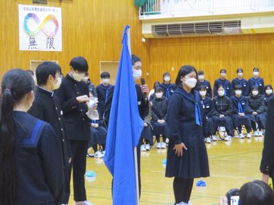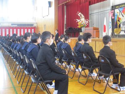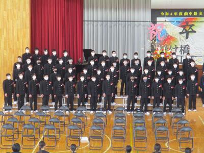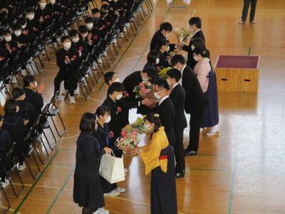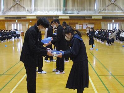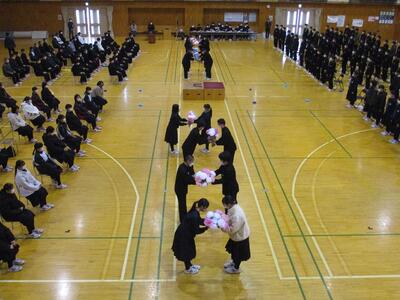 2月21日(火)に、生徒会主催の「花を贈る会」を行いました。昨年度はリモートでの開催でしたが、今年度は体育館で行い、各家庭1名という限定ではありましたが、3年生の保護者にも案内を出しました。インフルエンザによる閉鎖を行っている学級もあったため、1年生は教室でリモートによる参観、2年生と3年生が体育館に集い、会を進行しました。生徒会や部活動、応援団の3年生から2年生への「継承」や中学校生活を振り返るスライド上映、それぞれの学年による合唱発表等が行われ、最後は校歌を歌い、終了となりました。和やかな雰囲気の中で行われ、3年生も楽しんでいました。参観された保護者の皆様、ありがとうございました。